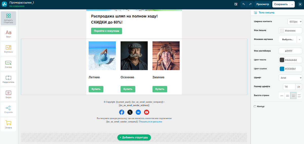 - Привлекает новых подписчиков на корпоративные аккаунты через кнопки соцсетей. Подписчики сразу из письма смогут перейти в ваши соцсети и узнать больше о бренде и его новостях. Это поможет добавить еще один канал связи и наладить более тесную коммуникацию с клиентами.
