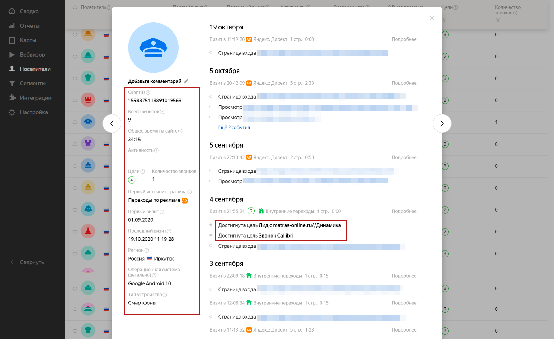 - Обогащение и трекинг лидов. Проводим сбор дополнительных данных о клиенте, заносим их в CRM-систему и подтверждаем — эта информация нужна для сегментации.На примере показан трекинг лида в «Яндекс.Метрика» — переходы по рекламному объявлению, просмотры страниц и заявка на обратный звонок.